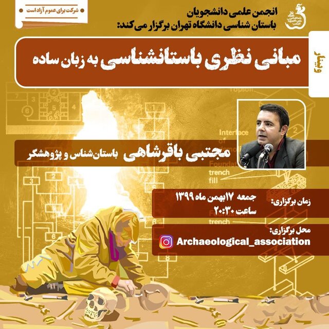 به گزارش باشگاه دانشجویان ایسنا، این برنامه با حضور و سخنرانی مجتبی باقرشاهی ـ باستان شناس و پژوهشگر، روز جمعه ۱۷ بهمن ماه ساعت ۲۲ به صورت زنده در صفحه اینستاگرام انجمن علمی دانشجویان باستانشناسی دانشگاه تهران به آدرس https://instagram.com/archaeological_association?igshid=۱ispxbti۰kemc برگزار خواهد شد.