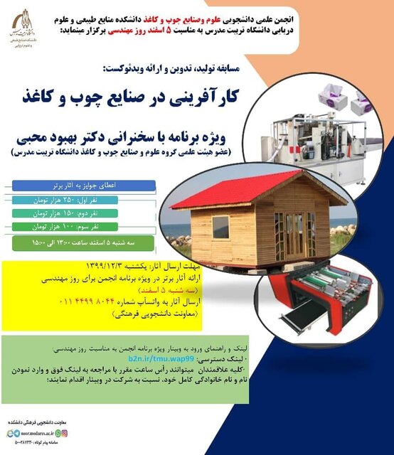 به گزارش باشگاه دانشجویان ایسنا، این برنامه به مناسبت روز مهندسی با سخنرانی دکتر بهبود محبی ـ عضو هیئت علمی گروه علوم و صنایع چوب و کاغذ دانشگاه تربیت مدرس همراه با برگزاری مسابقه کارآفرینی در صنایع چوب و کاغذ در قالب تولید، تدوین و ارائه ویدئوکست روز سهشنبه پنجم اسفند ساعت ۱۳ الی ۱۵ برگزار می شود.