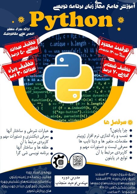 به گزارش باشگاه دانشجویان ایسنا، "چرا پایتون؟ "،"نصب و راه اندازی نرم افزار ژوپیتر"، "مقدمات، متغیر ها و دیتا تایپها"، "معرفی لیست و دستورات مهم و کاربردی مرتبط با آن"، "عبارات شرطی و ساختار آنها (if-else clause)"، "معرفی دیکشنری و دستورات مهم و کاربردی مرتبط با آن"، "حلقه ها و ساختار آنها (for while break continue)"، "توابع در پایتون" و "برنامه نویسی شی گرا (OOP)" از جمله مباحث و سرفصلهایی است که در این دوره آموزش داده می شود.
