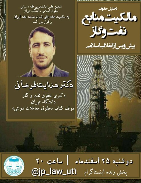 انجمن علمی دانشجویی فقه و مبانی حقوق اسلامی دانشگاه تهران، وبینار «مالکیت منابع نفت و گاز پیش و پس از انقلاب اسلامی» را برگزار می‌کند.