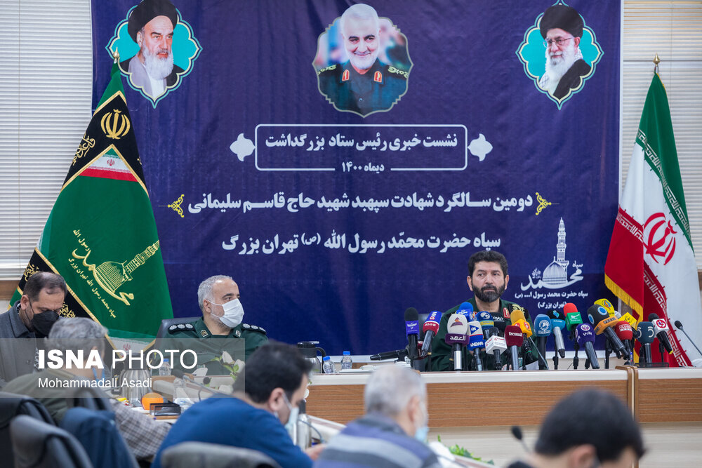 نشست خبری بزرگداشت دومین سالگرد شهادت سپهبد شهید حاج قاسم سلیمانی، دوشنبه ۶ دیماه ۱۴۰۰ با حضور سردار حسن حسنزاده فرمانده سپاه محمد رسول الله(ص) تهران بزرگ در ساختمان ستاد فرماندهی سپاه تهران برگزار شد.