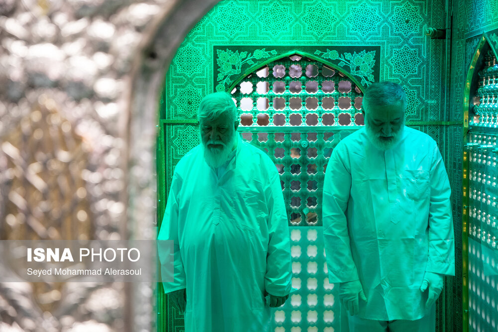 • حجت الاسلام سیّد اسماعیل خطیب، وزیر اطلاعات و یعقوبعلی نظری، استاندار خراسان رضوی در آیین غبارروبی حرم مطهر حضرت رضا (ع)