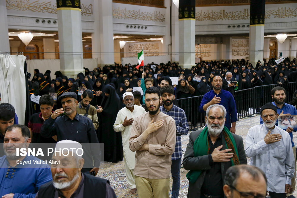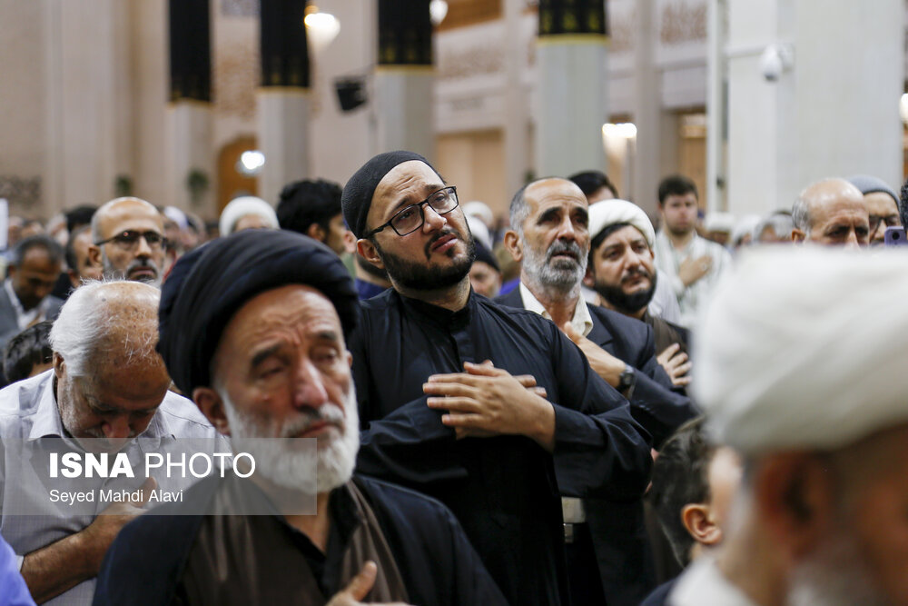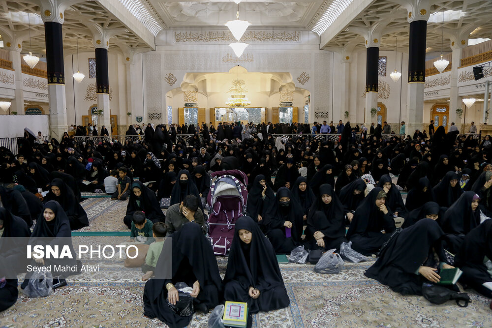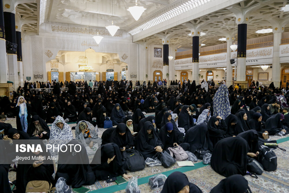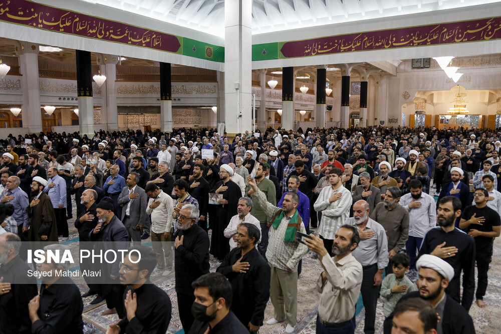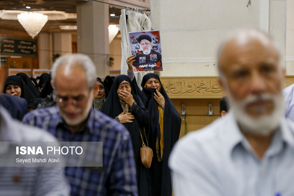 زائران و مجاوران حرم مطهر حضرت معصومه (س) دوشنبه ۳۱ اردیبهشت ۱۴۰۳ با تجمع در شبستان امام خمینی (ره) در سوگ از دست دادن سید ابراهیم رئیسی، رئیس جمهور عزاداری کردند.