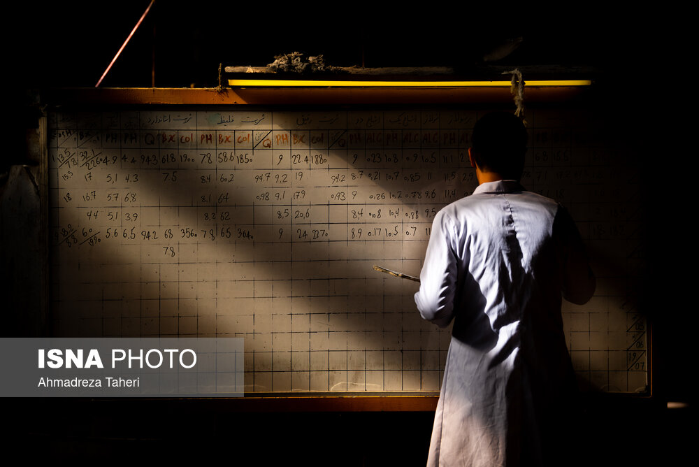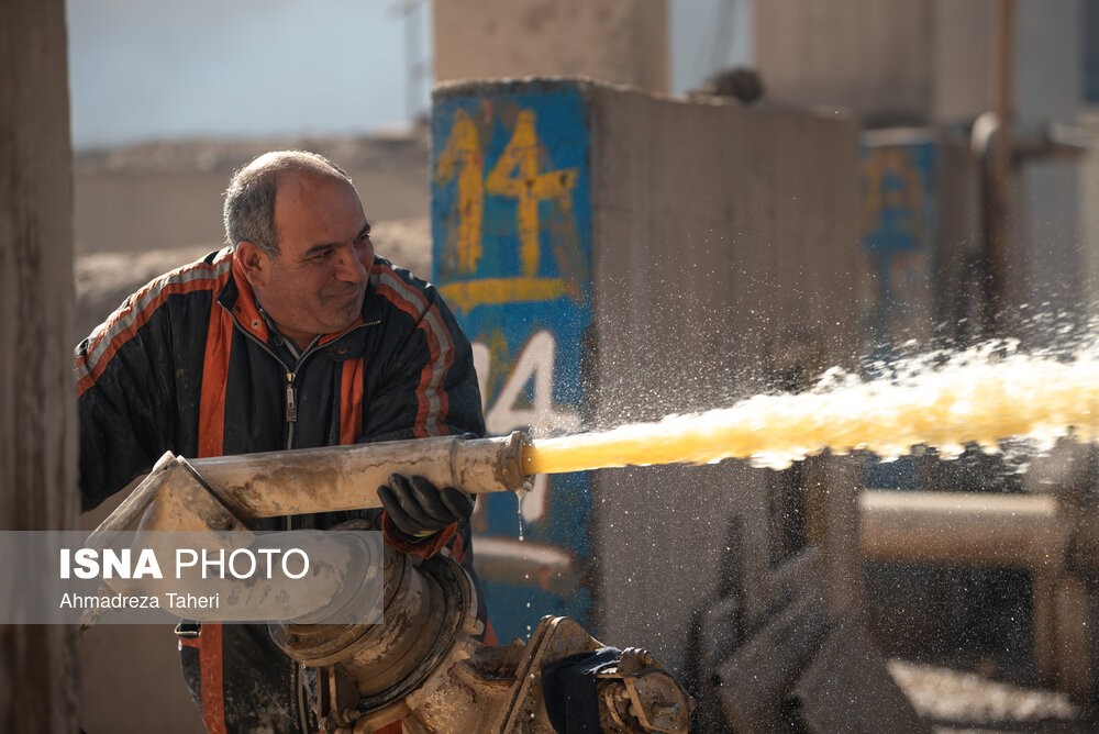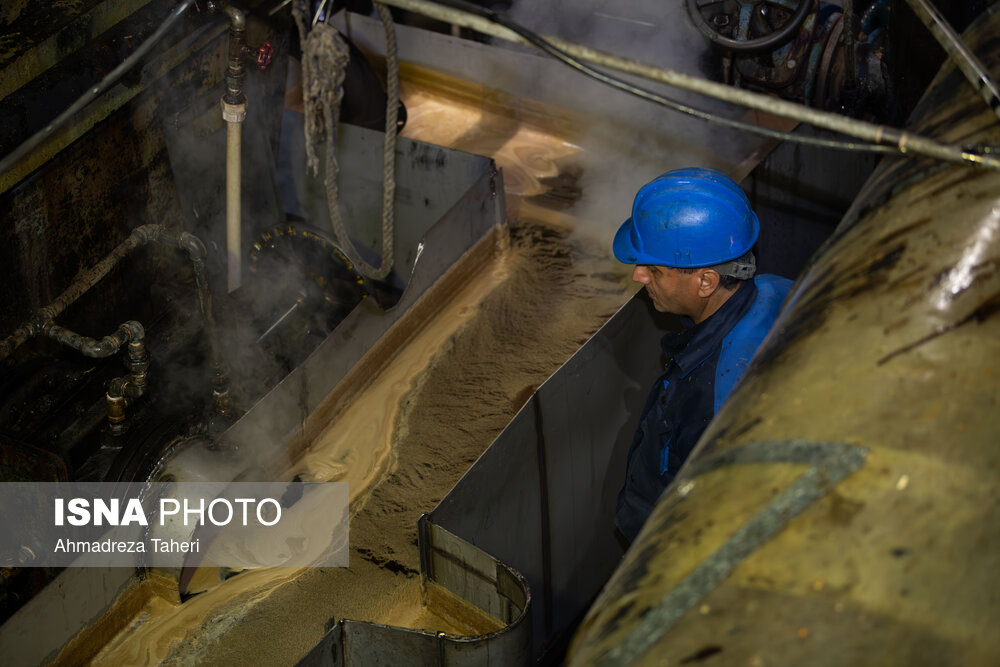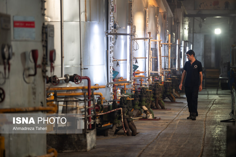 • یکی از کارگران کارخانه قند اصفهان مشغول نظارت بر شکر مایع است.