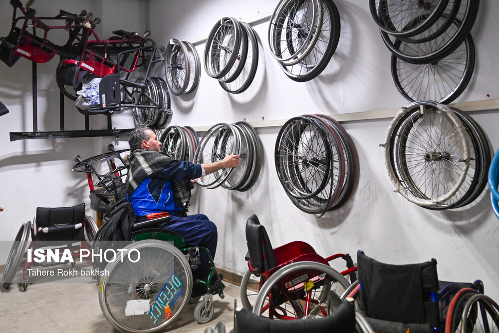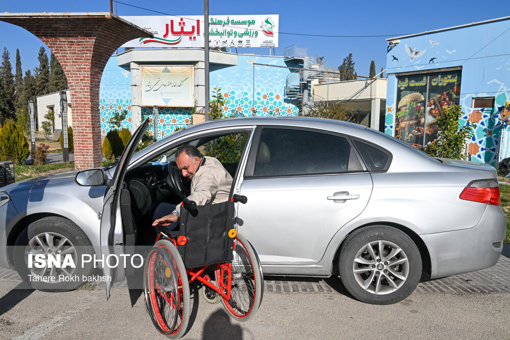 • ورود یکی از اعضای تیم سکتبال با ویلچر جانبازان فارس به محل مسابقات