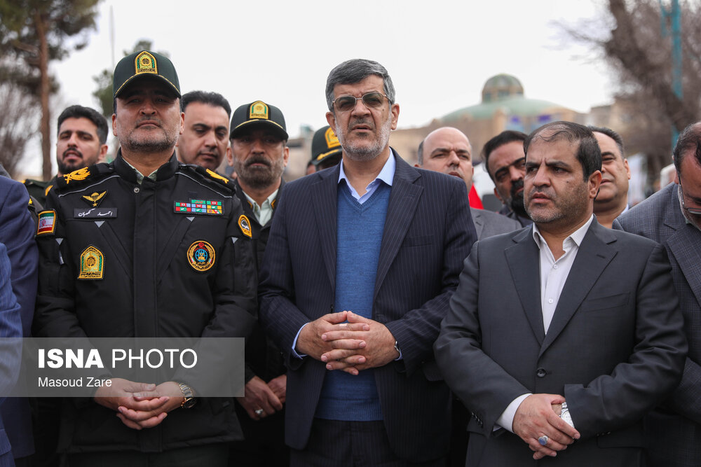 • از سمت راست، اسمائیل دهستانی معاون سیاسی، امنیتی و اجتامعی استاندار، محمد رضا بابایی استاندارغ سردار احمد نگهبان فرمانده انتظامی استان در راهپیمایی ۲۲ بهمن ۱۴۰۴ در یزد