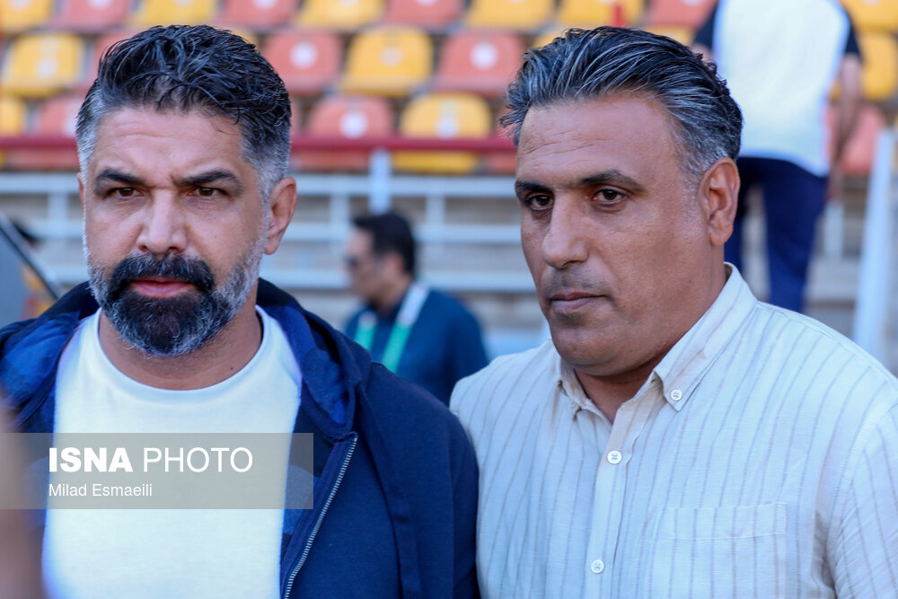 • از راست: امیر خلیفه اصل سرمربی استقلال خوزستان و پیروز قربانی سرمربی فجر سپاسی