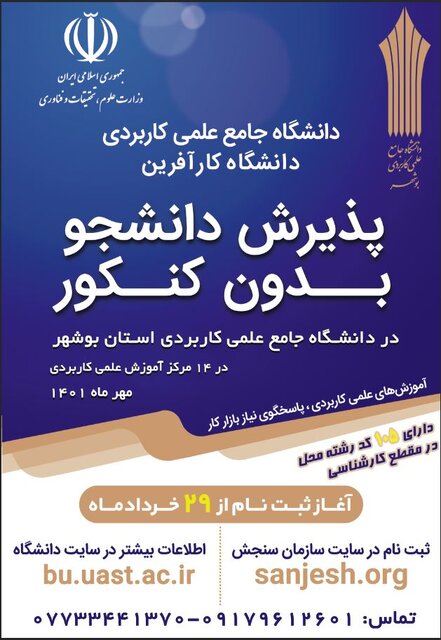 فضل اله لک در گفتگو با ایسنا با بیان اینکه ثبت نام بدون آزمون در دانشگاه جامع علمی کاربردی استان بوشهر از ۲۹ خرداد آغاز میشود، اظهار کرد: متقاضیان تحصیل در مقطع کارشناسیناپیوسته میتوانند از روز ۲۹ خردادماه به مدت یک هفته در سایت سازمان سنجش ثبت نام کنند.